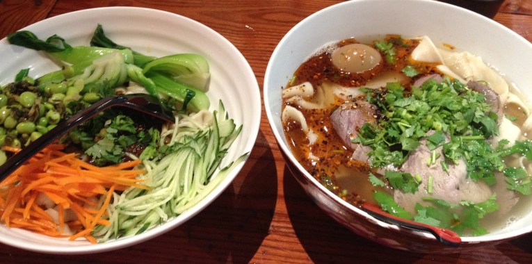 The house specialty is noodle soup in the Lan Zhou style: a mild broth with thin sliced beef, cilantro, green onion, and chili oil—the amount used corresponds to the level of spiciness you request. There’s also chili oil at the table, in case you want more heat. The soup comes in three sizes, and the large is enormous. You also choose the shape of the noodle—round or flat, each available in several sizes, from moxi, the thinnest round noodle, to da kuan, which is the widest flat noodle, upwards of an inch wide. Get the combo, which includes a side salad—choose from edamame, spicy cucumber salad, or pickled vegetables—as well as a delicious tea egg added into your soup.